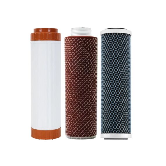 Набор сменных картриджей Гейзер №10 устанавливается в проточный фильтр для очистки железистой воды: